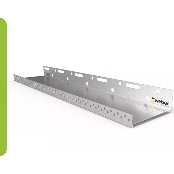 Perfil de aluminio de 2,5 m de longitud con forma de U y sistema anti-goteo para cierre o arranque horizontal en zócalos de los sistemas de aislamiento térmico por el exterior webertherm.