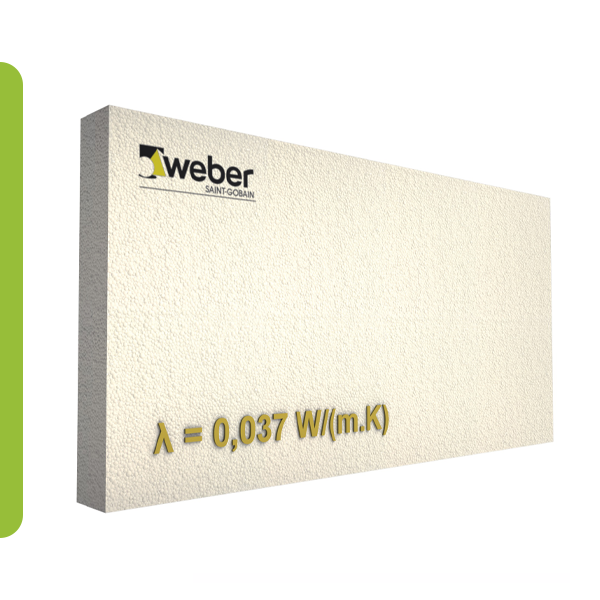 Placa estabilizada de poliestireno expandido (EPS) de conductividad térmica 0,037 Wm·K, para uso como material aislante en el sistema de aislamiento térmico por el exterior webertherm etics.